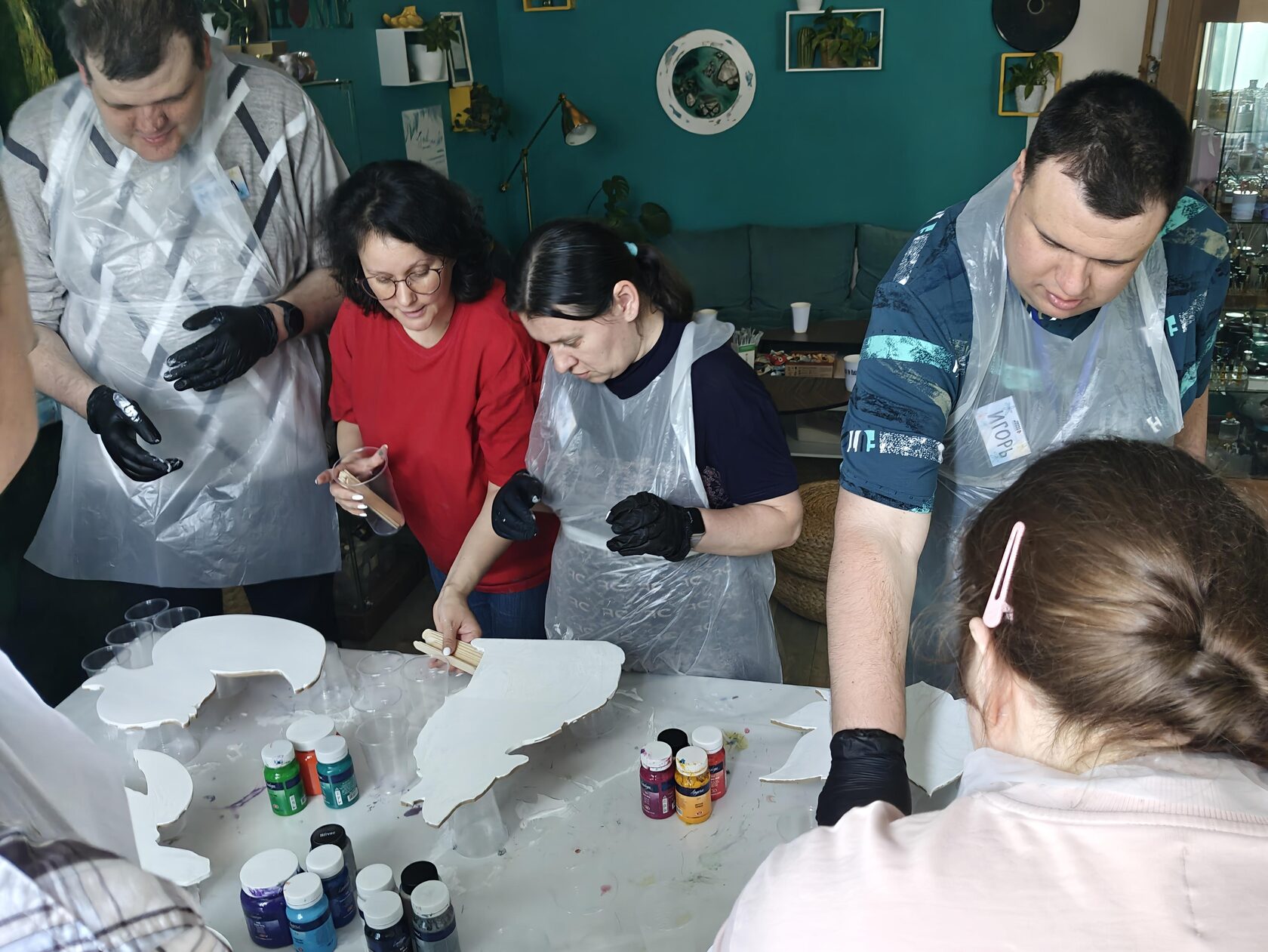 А затем началось самое интересное – волшебство превращения жидких красок в уникальные картины. Техника флюид-арта, где краски свободно растекаются и сливаются в причудливые узоры, идеально подошла для наших подопечных. Она не требует специальных навыков, позволяя каждому проявить свою фантазию и получить потрясающий результат.